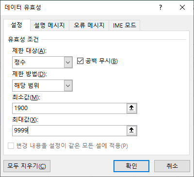 [데이터 유효성] 대화상자 [설정] 탭에서 [제한 대상]은 '정수', [제한 방법]을 '해당 범위'로 지정해서 최소값 1900, 최대값 9999를 입력합니다.