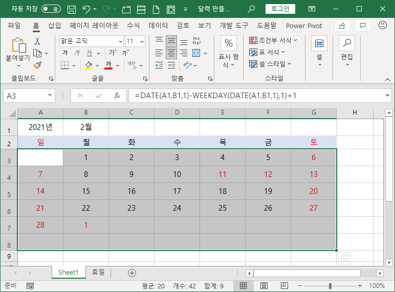 달력 만들기 - 날짜 함수, 조건부 서식, 유효성 검사, 표시 형식