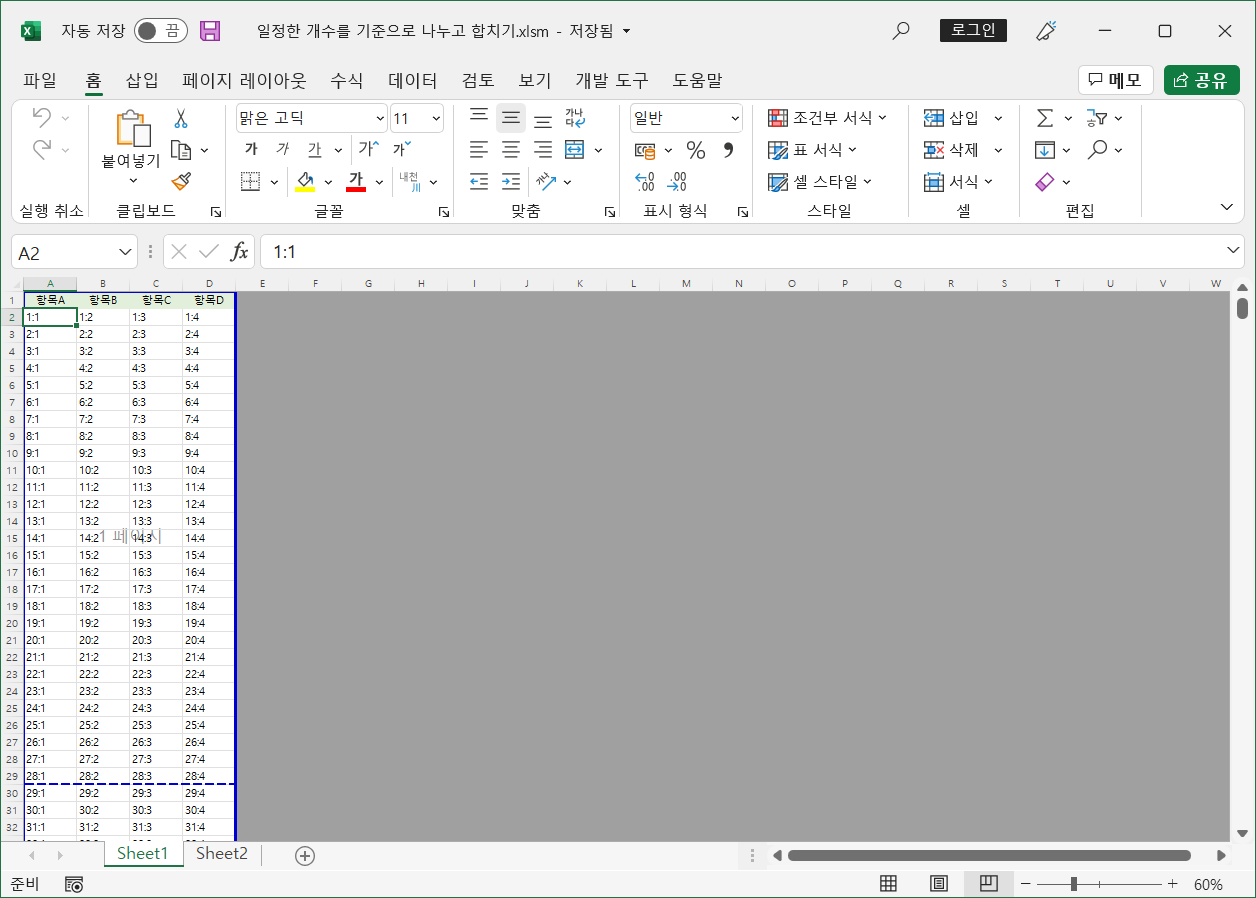 여기서는 데이터 행 28개, 5단으로 구성합니다.