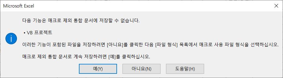 그렇지만 여기서는 필요한 작업을 다 했고 다시 할 필요도 없기 때문에 VBA를 제외하고 저장합니다.