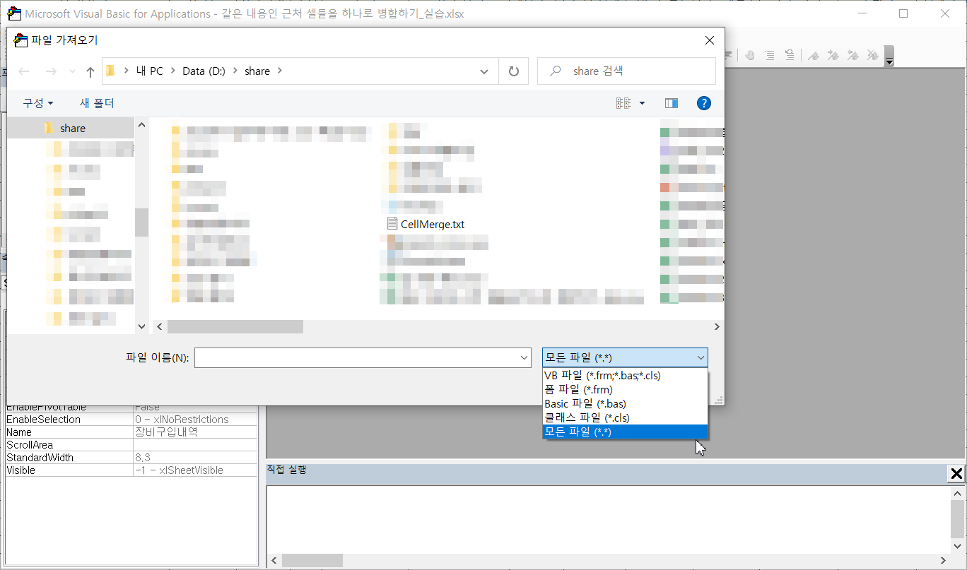 다운로드한 VBA 소스파일 확장자가 TXT이기 때문에 [파일 가져오기] 대화상자 아래 [파일 확장자] 선택창에서 '모든 파일'을 선택합니다.