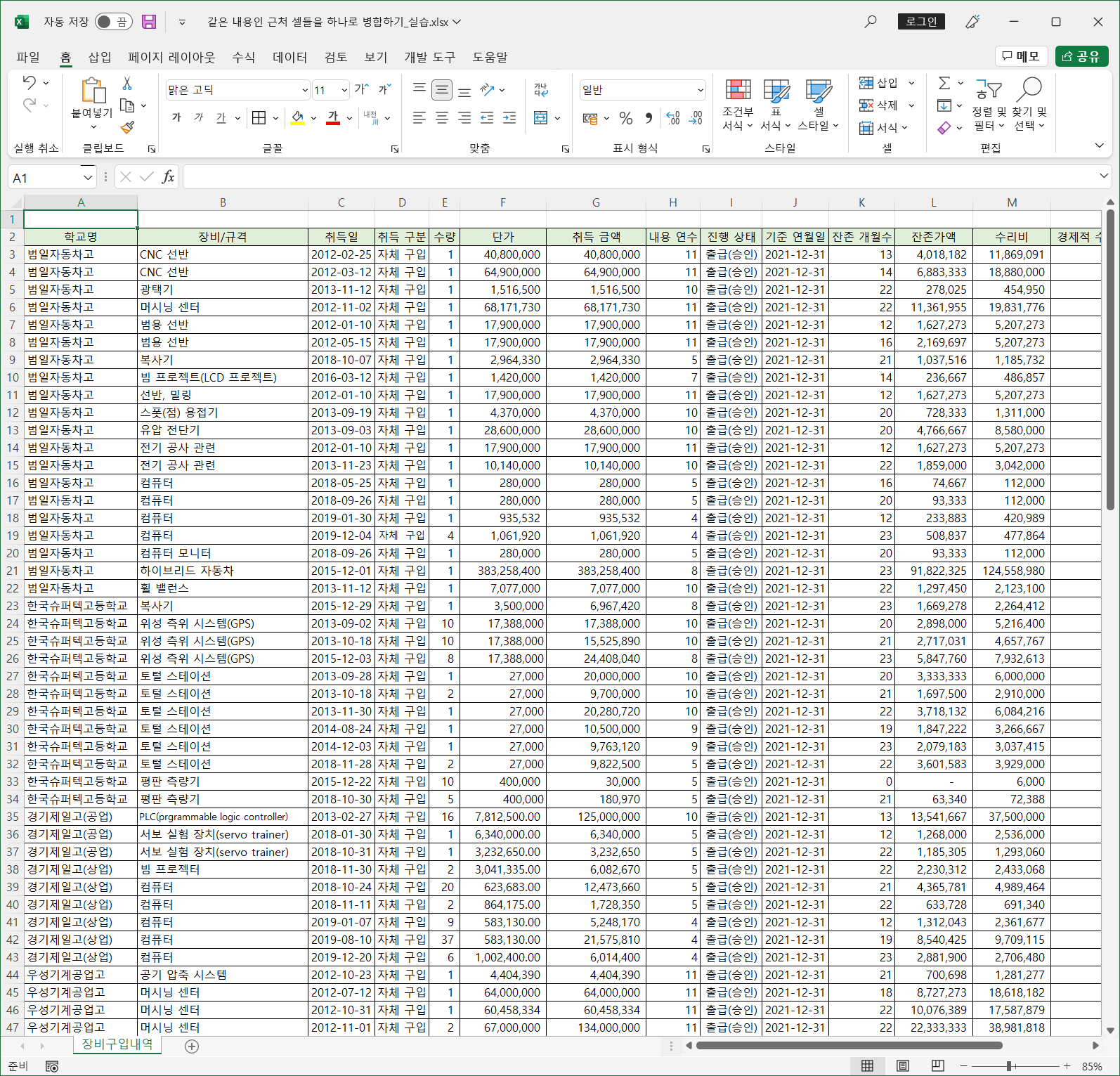 엑셀 실무] 병합된 셀을 해제하고 빈 셀에 데이터 채우기