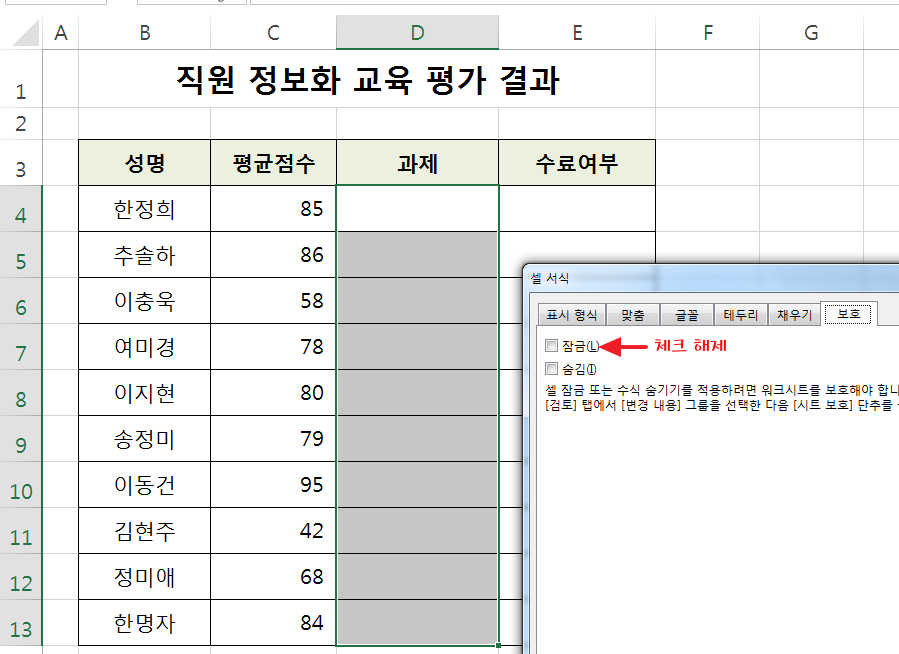 직원 정보화 교육 평가 결과 데이터에서 평균 점수까지 처리하고 문서를 공유하여 과제 제출 여부를 입력 받으려고 합니다. 이때 과제 제출 범위를 제외하고 나머지 범위를 보호 하겠습니다.
