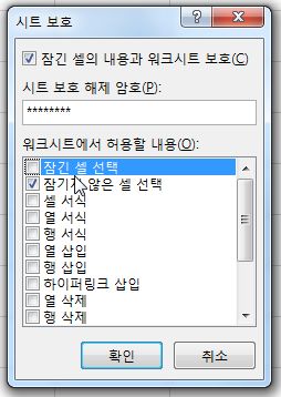 허용할 내용 중에 '잠긴 셀 선택'과 ‘잠기지 않은 셀 선택’ 옵션이 기본적으로 허용할 내용으로 선택 되어 있습니다.