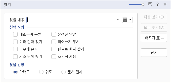 한글 [찾기] 기능에는 조건식을 설정할 수 있는 선택 사항이 있습니다.