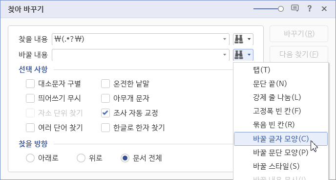 선택 사항에서 '조건식 사용'을 체크하고, 찾을 방향에서 '문서 전체'를 선택합니다.