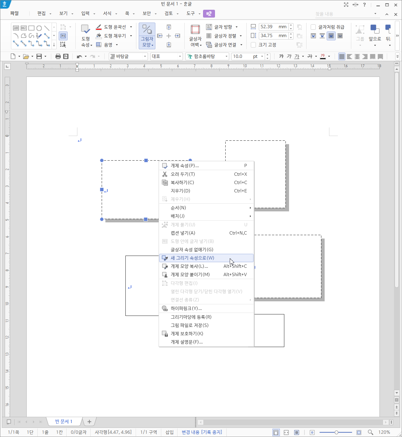 그런 다음 도형을 선택하고 마우스 오른쪽 클릭해서 다시 [새 그리기 속성으로(W)]를 선택합니다.