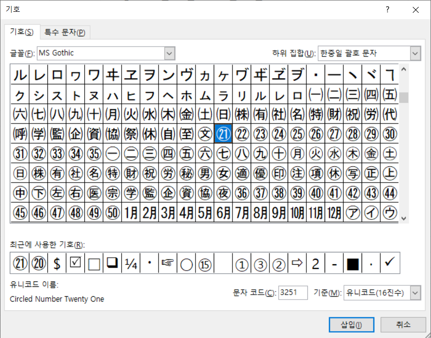 하위 집합 항목에서 한중일 괄호 문자를 선택하면 원문자 21부터 50까지 있습니다.