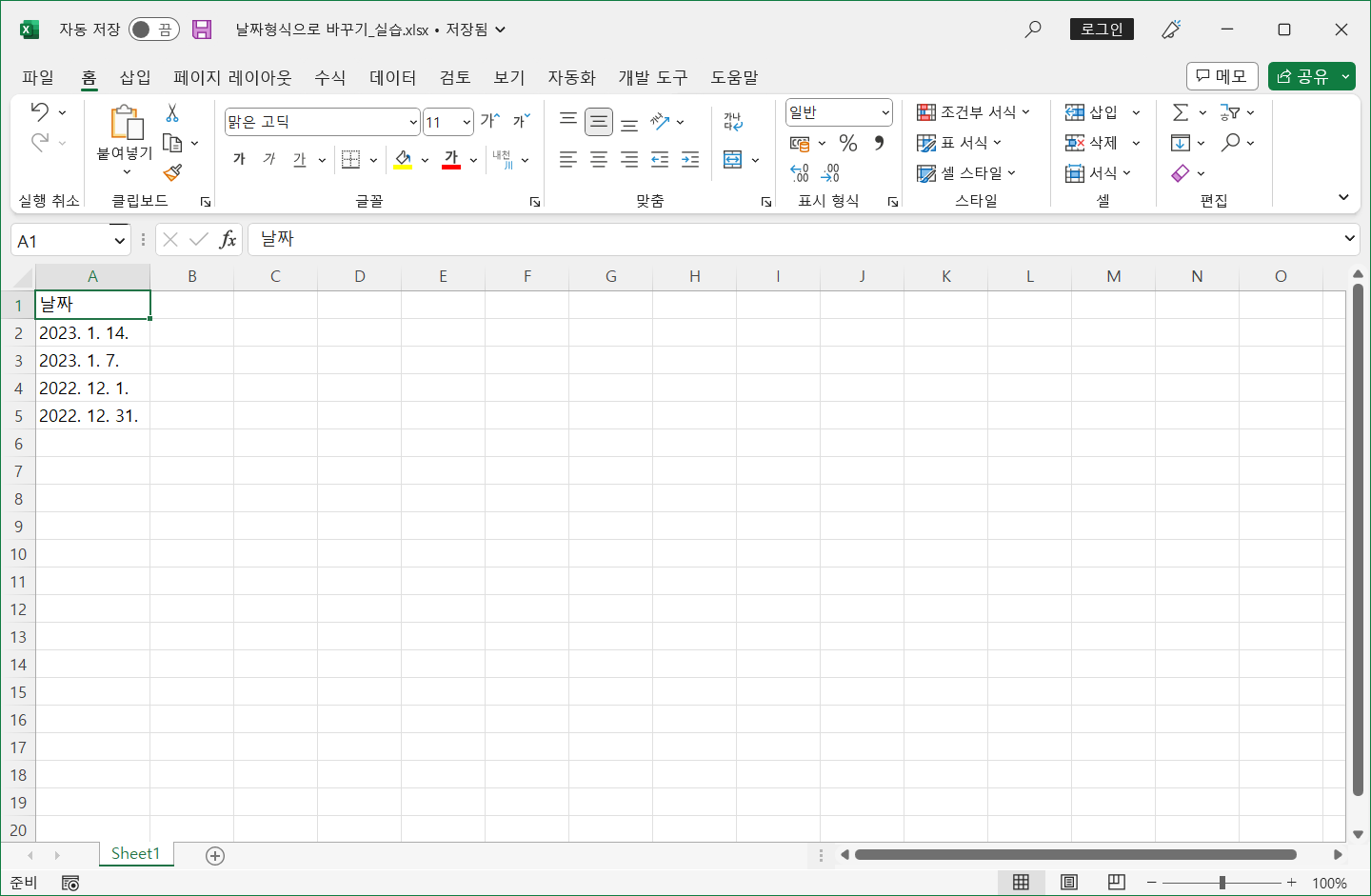 날짜를 텍스트 형식으로 다루어도 화면에서 보여지는 모습은 알아 볼 수 있으니 상관없지만, 엑셀 기능을 써서 뭔가 처리를 하려면 날짜 형식 데이터여야만 합니다.