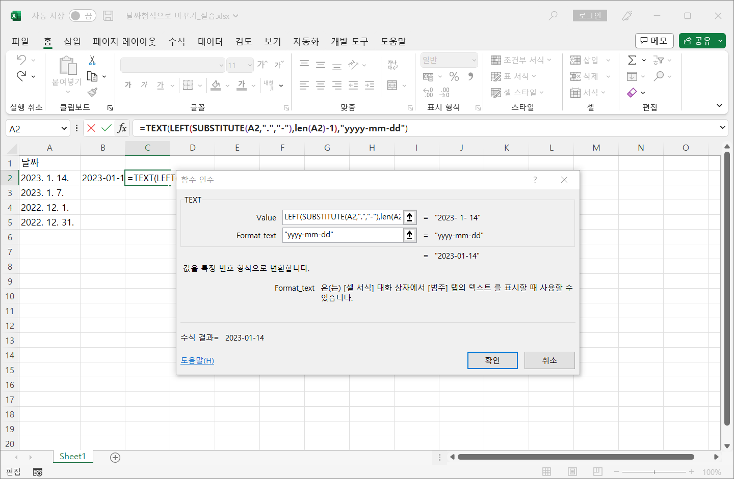 이번에 생각한 방법은 SUBSTITUTE 함수를 이용해서 마침표를 빼기 기호로 바꾸고, LEN 함수로 전체 길이를 구한 후 LEFT 함수를 써서 마지막 글자만 빼고 가져와서 TEXT 함수를 이용해서 날짜 형식으로 나타내는 것입니다.