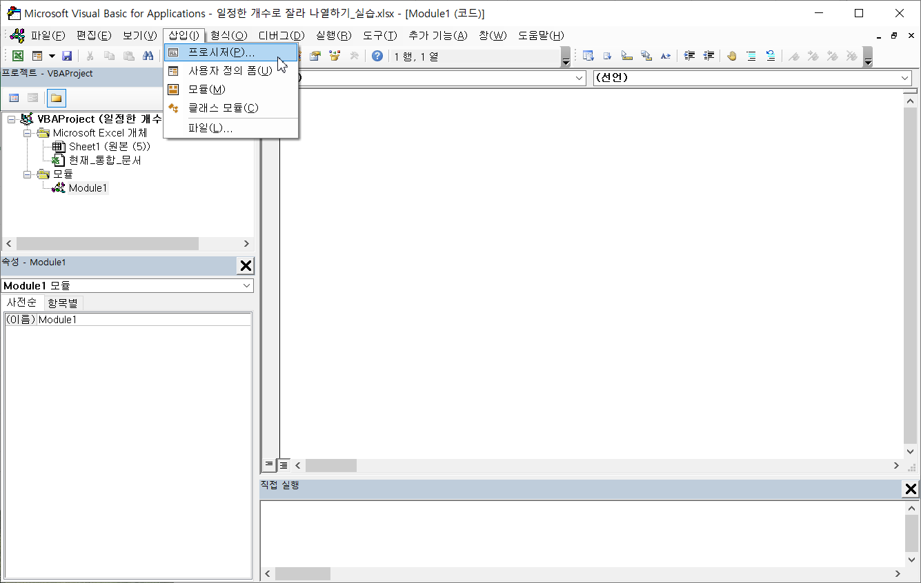 [삽입]-[프로시저]를 누릅니다.