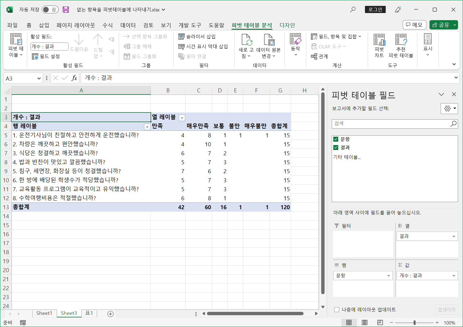 설문 조사 답안 항목은 매우만족, 만족, 보통, 불만, 매우불만 총 5가지인데, 설문 조사 결과 중 모든 경우에 대한 답변이 없이 일부만 있다면 피벗 테이블 결과에 없는 항목은 아예 안나오는 문제가 있습니다.