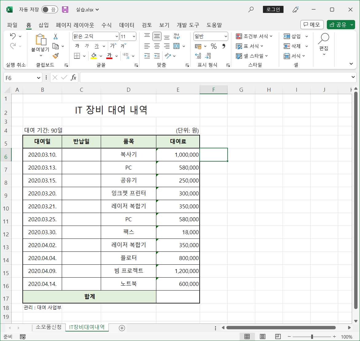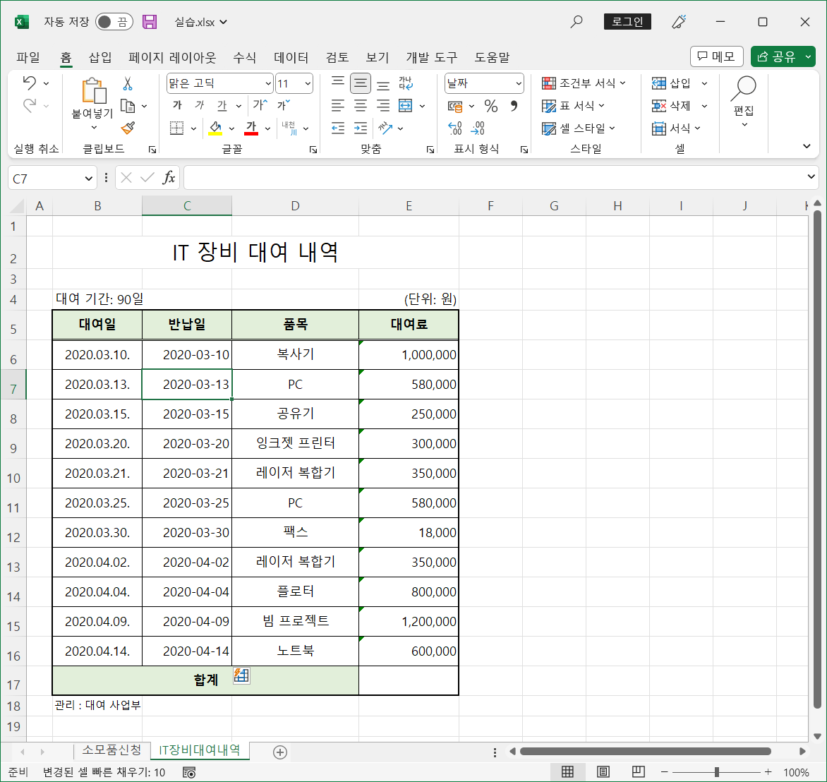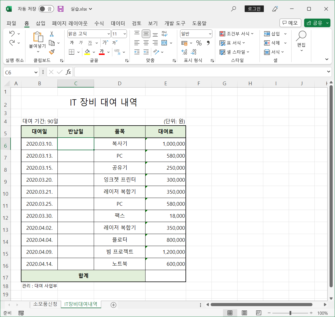 IT장비대여내역 시트에 바꾸려는 데이터가 있습니다.