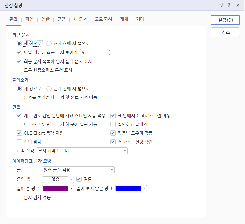 참고로 한글에서는 [도구]-[환경 설정]-[편집]에 하이퍼링크 글자 모양을 수정하는 항목이 있습니다.