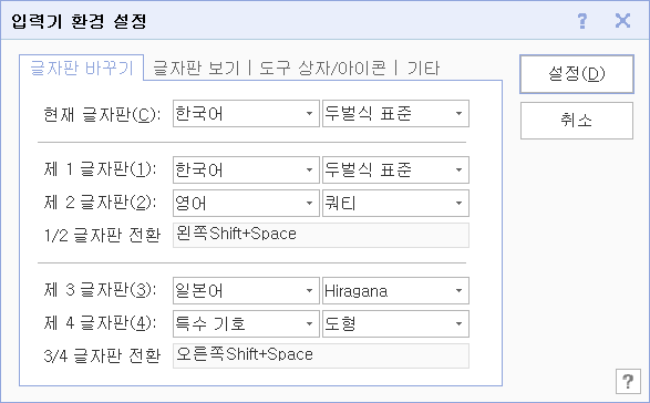 <Alt + F2>를 눌러 입력기 환경 설정 대화상자를 나타내고 제3글자판 선택에서 두번째 목록상자를 클릭하면 5가지 종류 선택항목을 보여 줍니다.