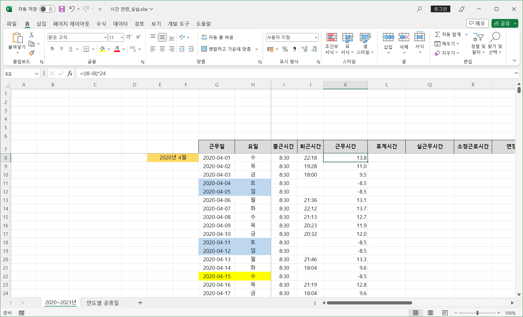 [K8] 셀에 근무시간을 계산하는 수식이 있습니다.