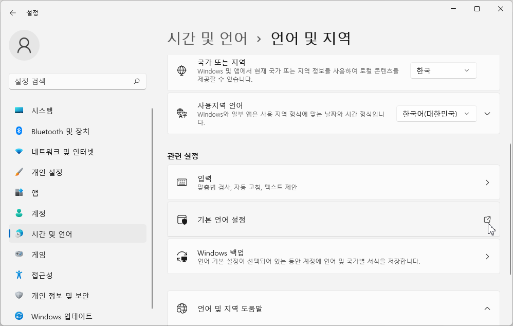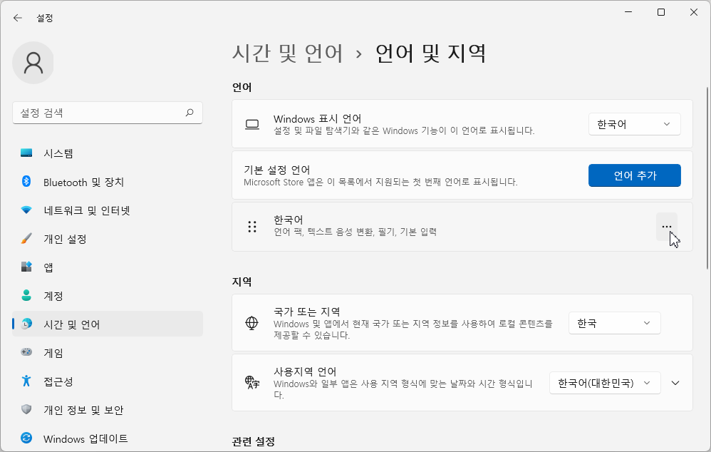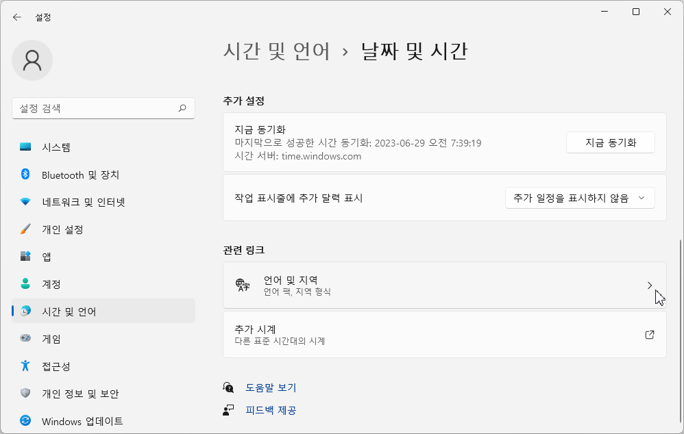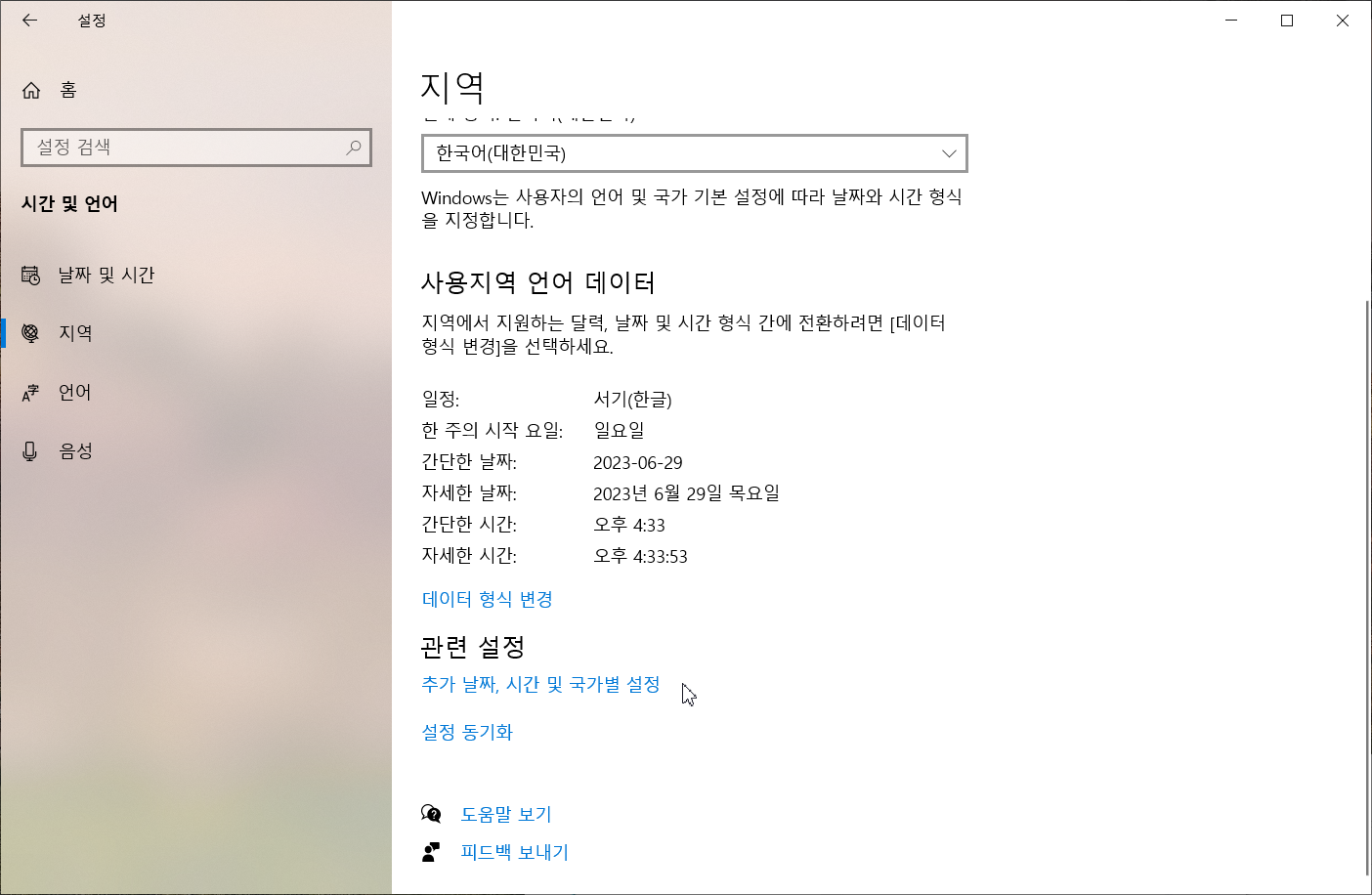 [지역]을 선택하고 '관련 설정' 중 [추가 날짜, 시간 및 국가별 설정]을 선택합니다.