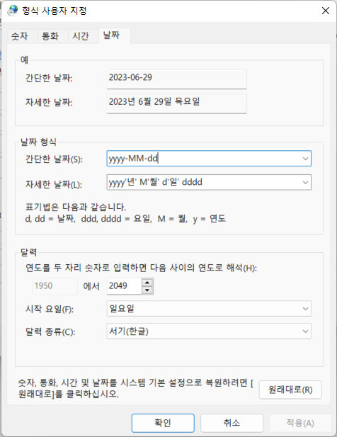 기본적으로 나타나는 날짜 표시형식 바꾸기