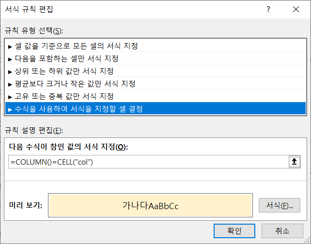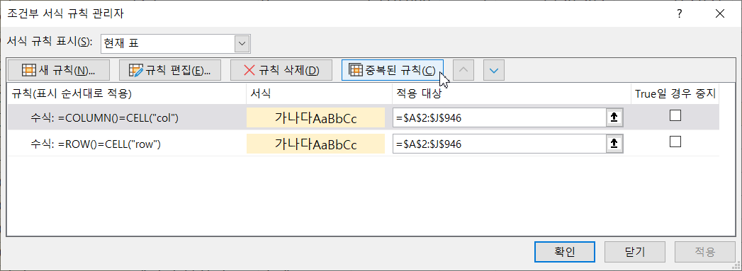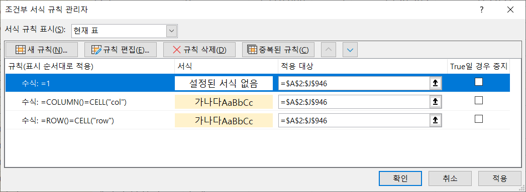 셀을 선택하면 행/열에 색상이 표시되도록 하고 싶다면 첫번째 조건부 서식 규칙 'True일 경우 중지'에 체크를 없앱니다.