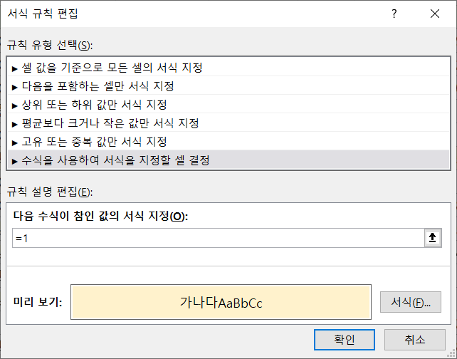 '다음 수식이 참인 값의 서식 지정'에 이미 등록되어 있는 수식을 모두 지우고 =1을 입력합니다.