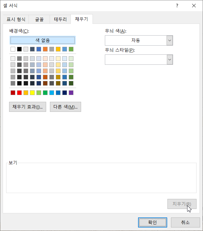 [서식]을 누르고 [채우기] 탭 아래의 [지우기]를 눌러 현재 적용된 서식을 없앱니다.
