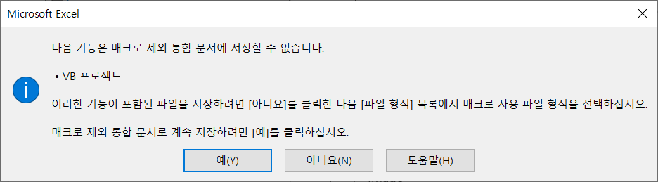 매크로를 쓸 수 없다는 정보메시지에는 [예]를 선택합니다.