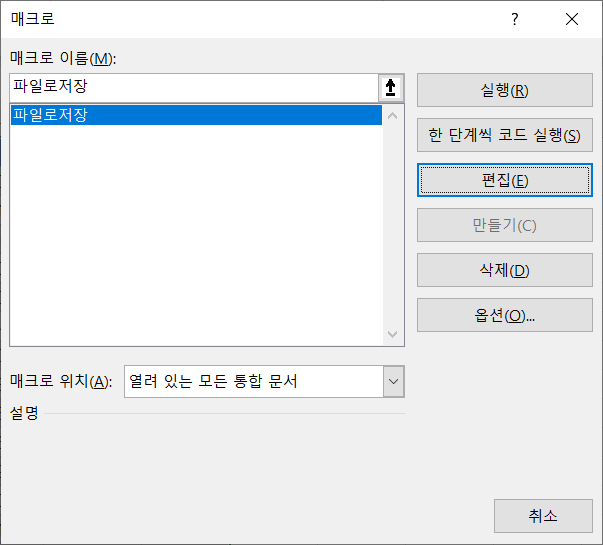'파일로저장' 매크로를 선택한 상태에서 [편집]을 누릅니다.