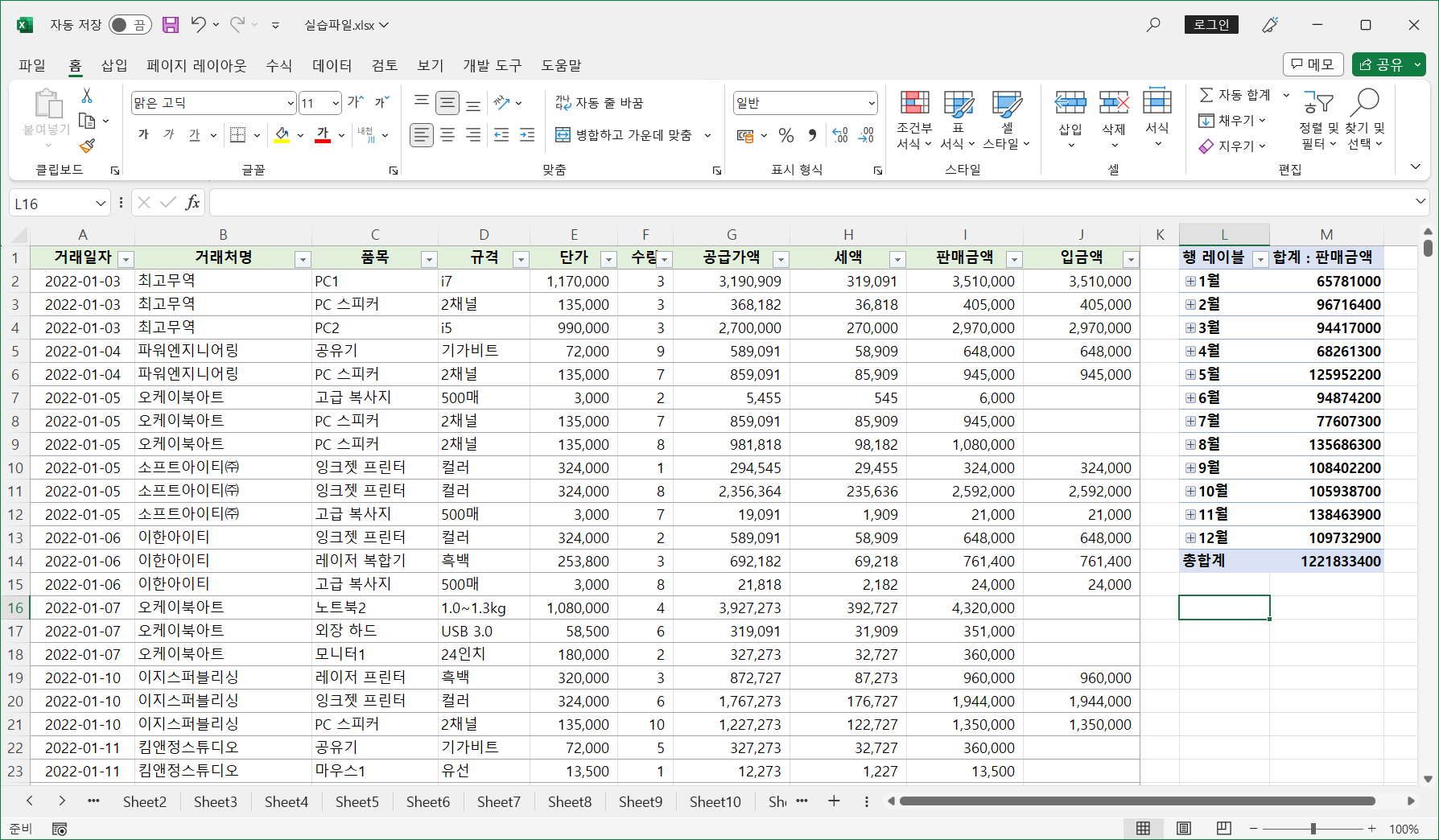 마지막 2022년 시트에 전체 데이터와 피벗 테이블이 있고, 첫번째 Sheet1부터 열 두번째 Sheet12까지 월별로 분리된 데이터가 있습니다.