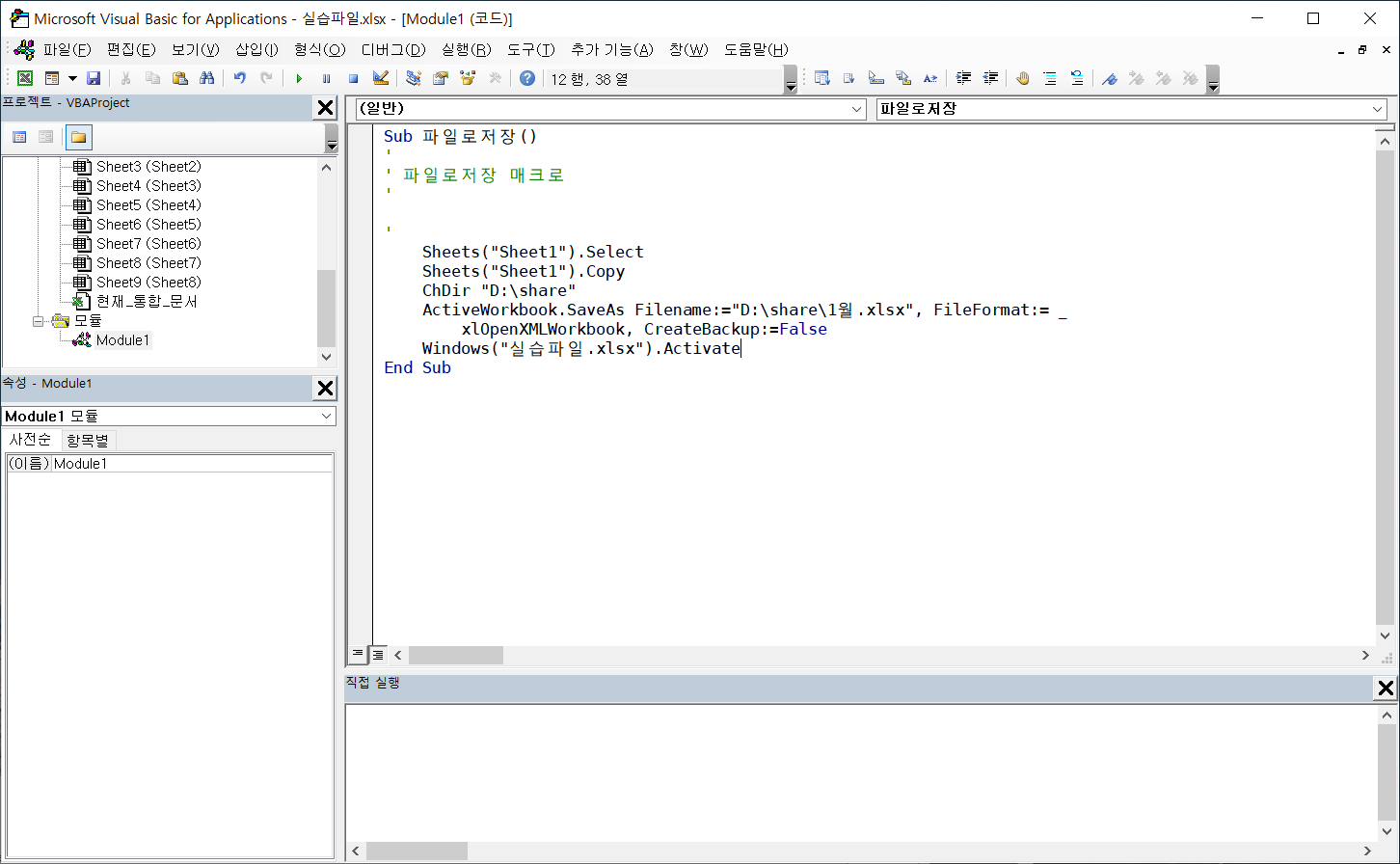 Sheet1부터 Sheet12까지 저장해야 하므로 반복문 For를 씁니다.