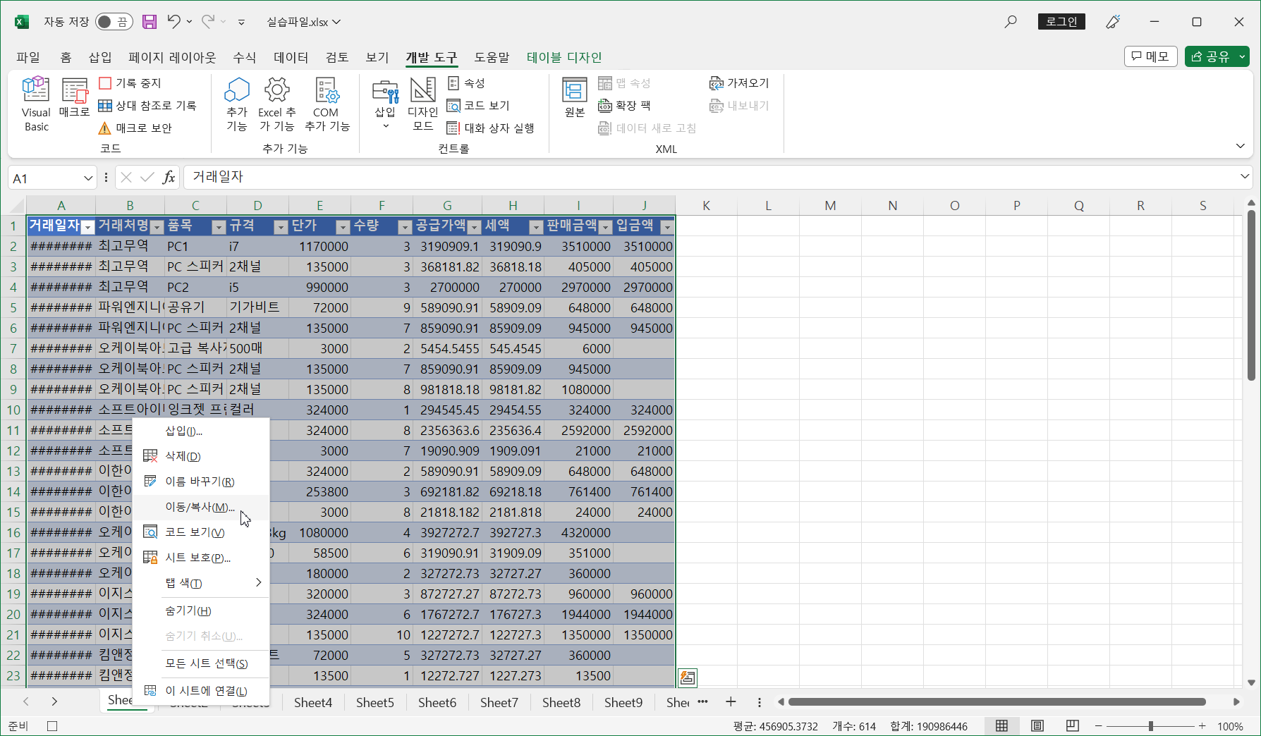 시트 탭 Sheet1에서 마우스 오른쪽 클릭해서 [이동/복사]를 선택합니다.