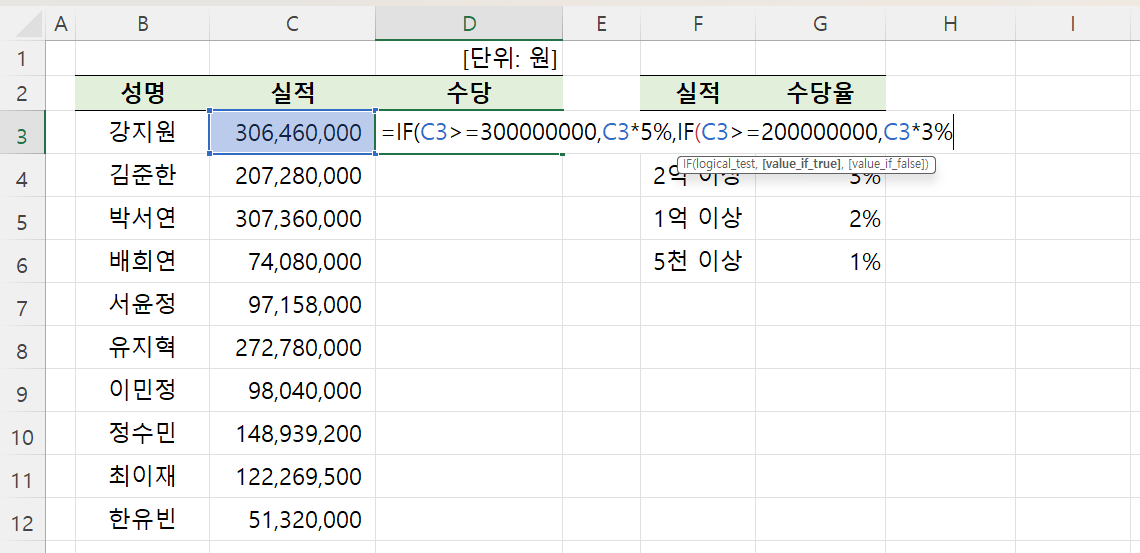 1. IF 함수를 입력하고 괄호를 연 다음 첫 번째 인수를 작성합니다. C3>=300000000(실적이 3억 이상)인지 조건을 작성합니다. 3억 이상이면 C3*5%(실적 곱하기 5%)인 참의 결과를 수식으로 작성합니다.