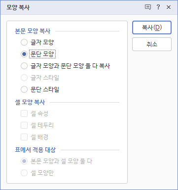 11. '문단 모양'을 선택하고 [복사]를 누릅니다.