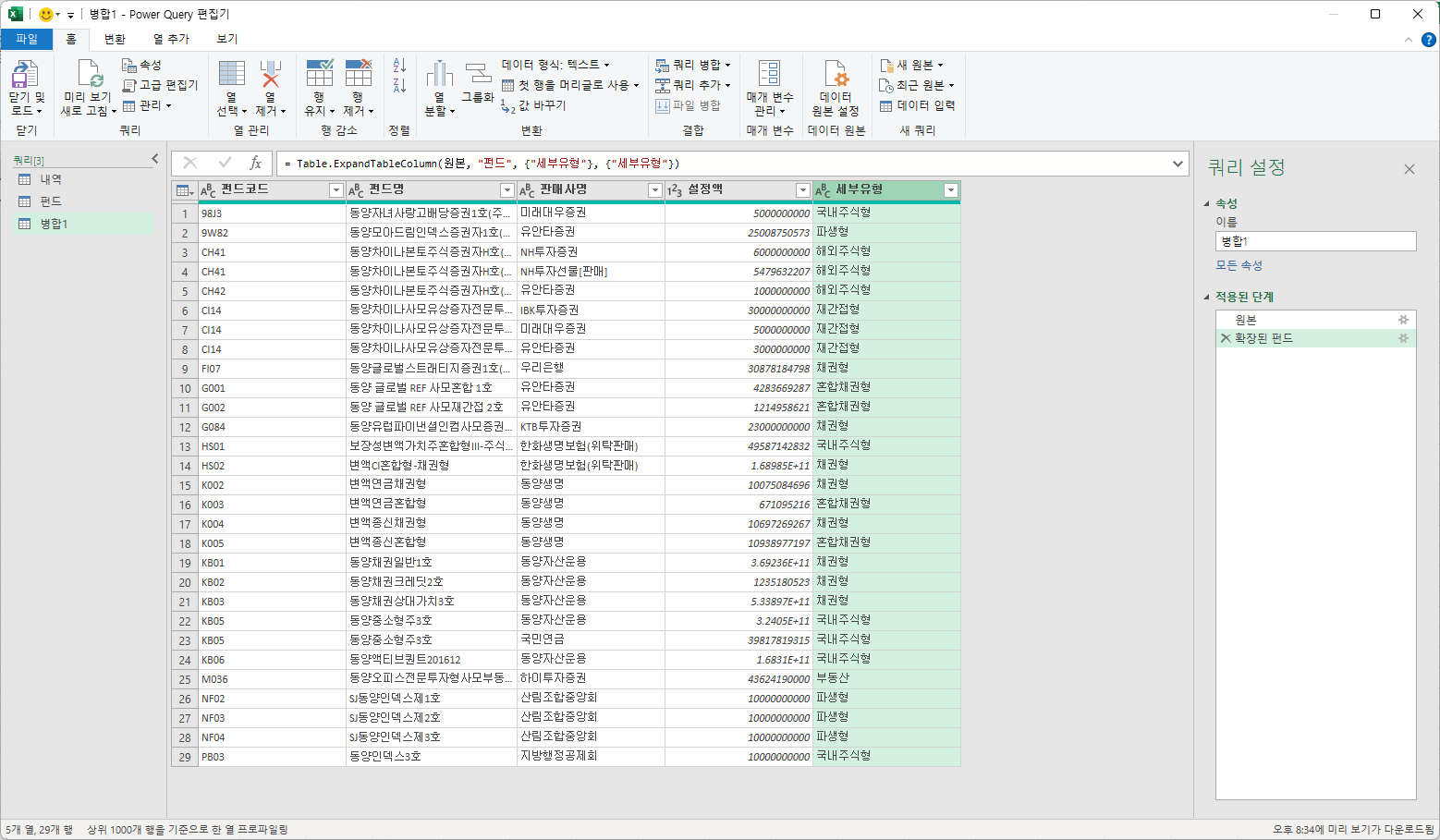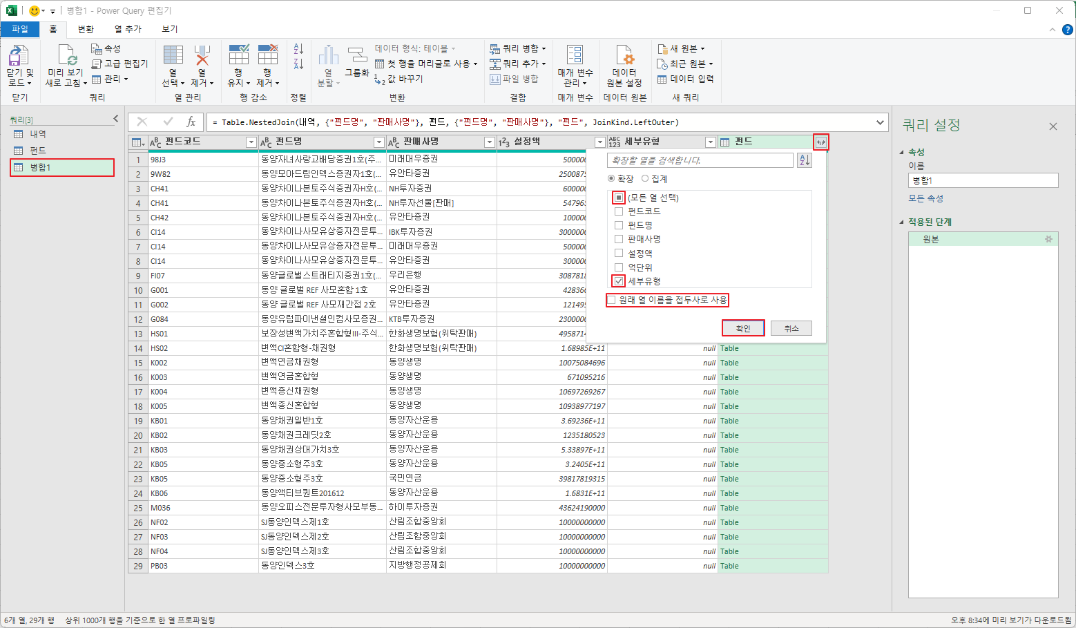 3. 왼쪽 [쿼리] 창을 보면 '병합1' 쿼리가 생성되었죠? '펀드' 필드에서 [확장] 버튼을 눌러 '(모든 열 선택)'에 체크 표시를 해제하고 '세부유형'에 체크 표시를 합니다. 그리고 '원래 열 이름을 접두사로 사용'에 체크 표시를 해제하고 [확인]을 누릅니다. '원래 열 이름을 접두사로 사용'에 체크 표시가 되면 필드명 앞에 테이블 명도 표시됩니다.