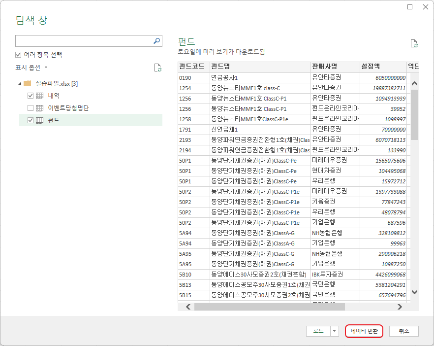 3. [탐색 창]이 실행됩니다. 실습파일.xlsx 파일에는 내역, 이벤트당첨명단, 펀드 시트가 있는데 사용할 테이블은 내역과 펀트 시트에 있으므로 '여러 항목 선택'에 체크 표시를 하고 '내역'과 '펀드' 시트에 체크 표시를 한 후 [데이터 변환]을 누릅니다.