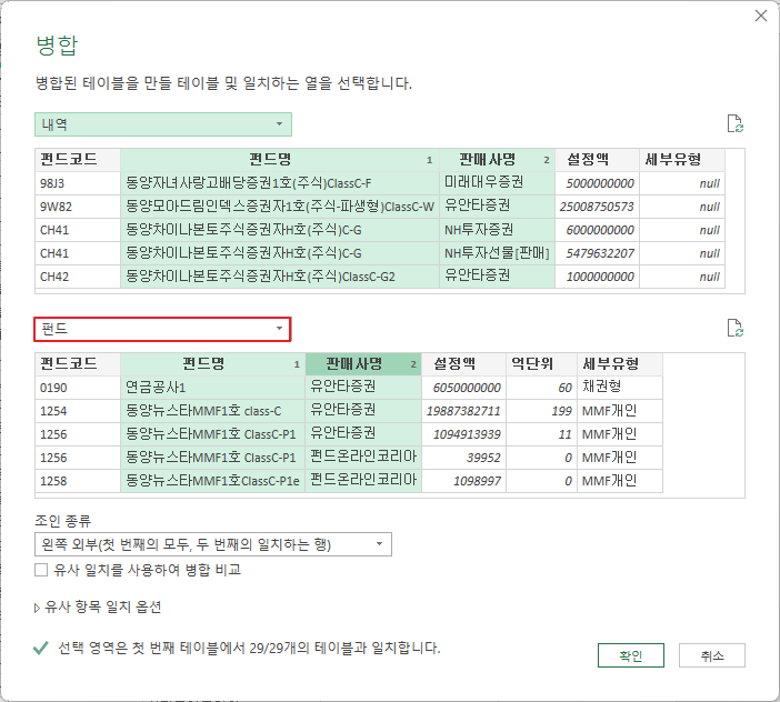 그럼 위에서 소개한 4단계를 거쳐 내역 시트와 펀드 시트의 테이블을 병합해 펀드명과 펀드사명이 일치하는 세부유형을 구해보겠습니다.