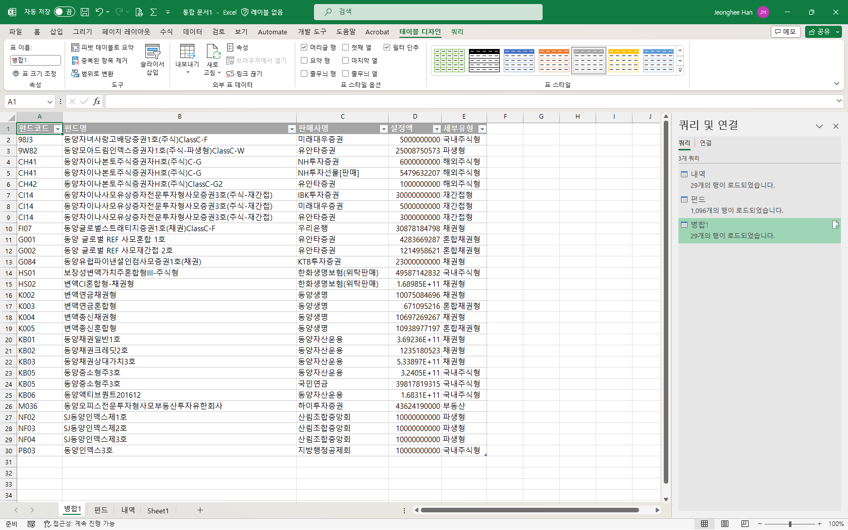 3. '병합1', '펀드', '내역' 시트가 생성되고 '병합1' 시트가 원하는 결과를 표시한 테이블이 됩니다. 보기 편하도록 [테이블 디자인] 탭 - [표 스타일 옵션] 그룹에서 '줄무늬 행'에 체크 표시를 해제하고 표 스타일도 변경하면 됩니다.