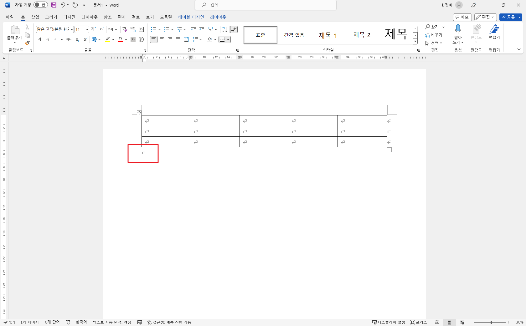 표를 넣으면 표 아래 빈 줄이 같이 나타납니다.