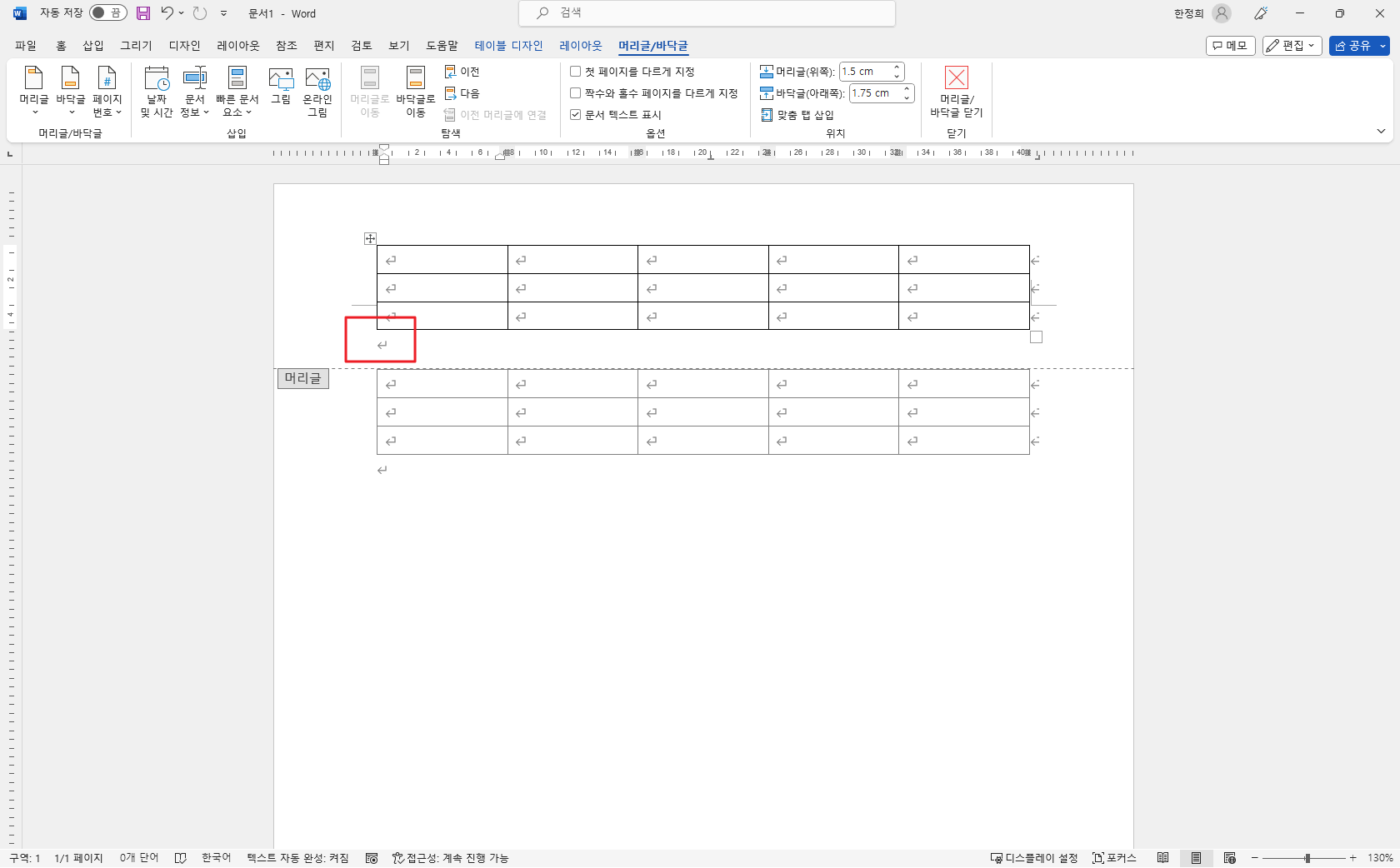 그런데 머리글에 표를 삽입하면 이 빈 줄이 공간을 차지합니다.