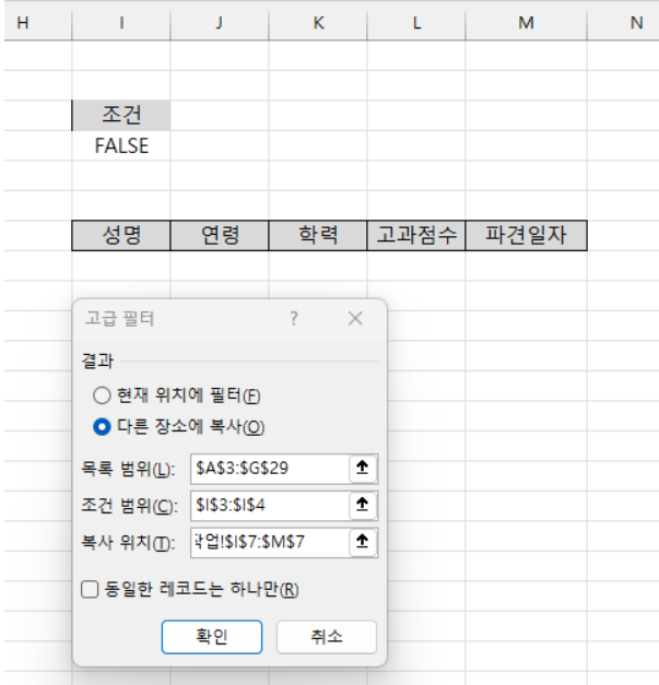 다른 장소에 복사를 선택한 후 활성화된 복사 위치에 [I7:M7] 셀 범위를 지정하고 [확인]을 누릅니다.