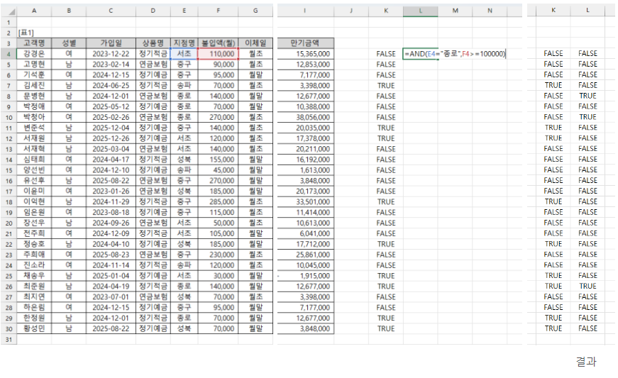 지점명[E4]이 종로E4="종로"이고 불입액(월)[F4]이 100000 이상F4>=100000인 두 조건이 모두 참이면 AND 함수는 TRUE를 반환합니다.