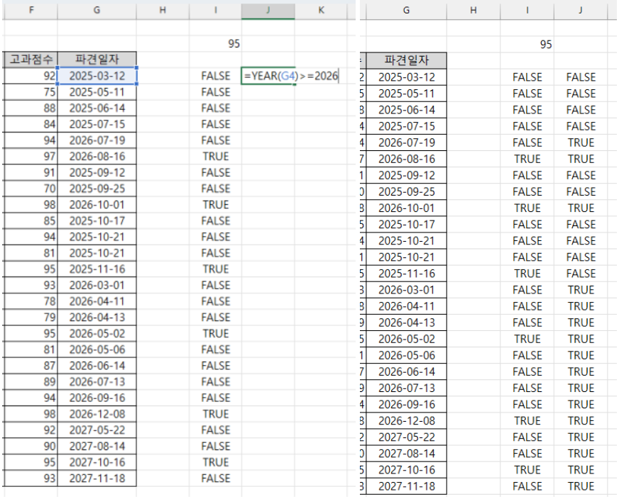 파견일자에서 구한 연도가 2026년 이후(2026 이상 또는 크거나 같다)인지 조건을 비교합니다. 수식을 복사하면 2026년 이후 파견일자는 TRUE로 표시됩니다.