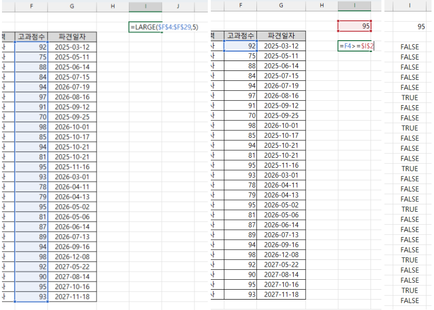 고과점수[F4:F29] 셀 범위에서 5번째 큰 값을 구합니다. 95점이네요. 각 고과점수가 5번째 큰 고과점수F4>=$I$2인지 비교합니다. 수식을 복사해 보면 고과점수 95 이상은 TRUE로 표시됩니다.