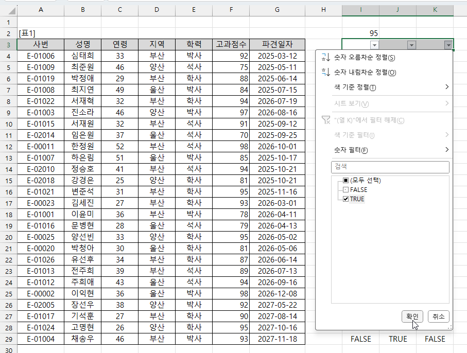 [M] 열의 필터 단추를 눌러 (모두 선택)에 체크 표시를 해제하고 TRUE에 체크 표시를 한 후 [확인]을 누릅니다.