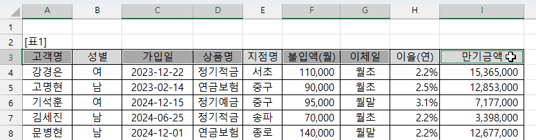 3. 지시 사항에 맞게 [K8] 셀 부터 결과가 표시되도록 고객명, 가입일, 상품명, 불입액(월), 일체일, 만기금액필드명을 선택해 복사한 후 [K8] 셀부터 붙여 넣습니다.