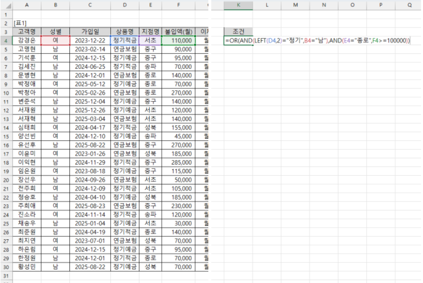 수식] =AND(LEFT(D4,2)="정기",B4="남")