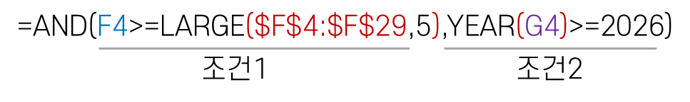 조건1: 고과점수[F4]가 고과점수 상위 5위LARGE($F$4:$F$29,5) 이내인지 조건을 비교합니다.