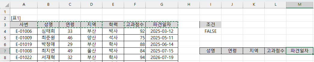 3. [표1]에서 성명, 연령, 학력, 고과점수, 파견일자 필드명을 복사해 [I7] 셀부터 붙여 넣습니다.