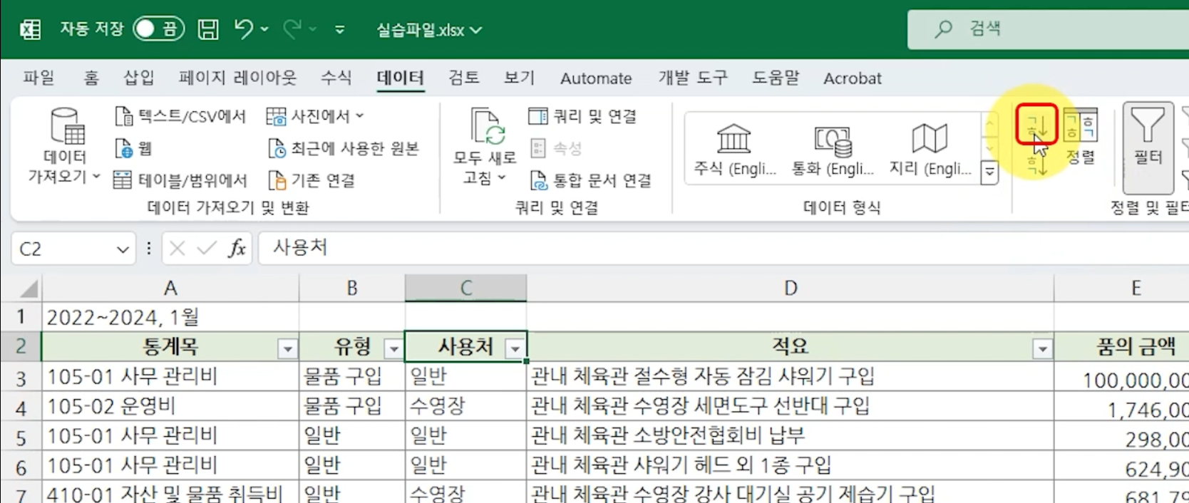 먼저 사용처 필드 범위에서 임의의 셀을 선택하고 [데이터] 탭 - [정렬 및 필터] 그룹 - [텍스트 오름차순 정렬]을 선택합니다.