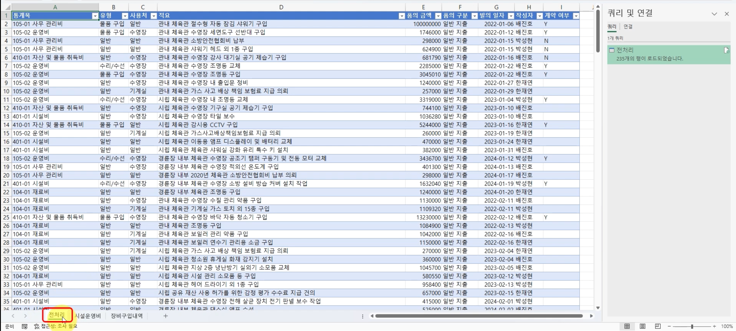 그랬더니 '장비구입내역전처리'라는 시트가 기존 시트 왼쪽에 추가됩니다.