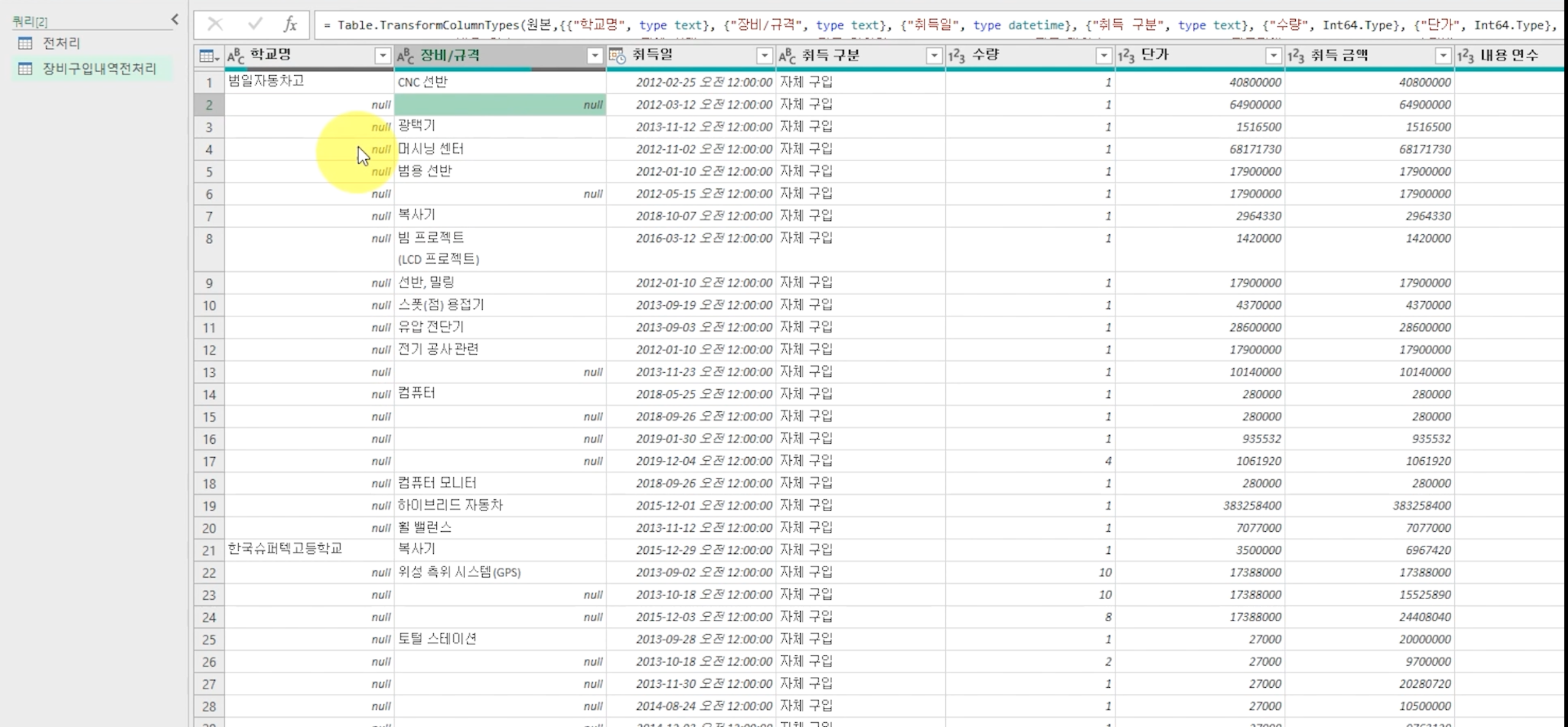 학교명과 장비/규격 필드가 병합되어 있기 때문에 정렬할 수 없습니다. 이 경우에도 파워 쿼리를 활용해 데이터 분석이 가능하도록 전처리를 하면 됩니다.